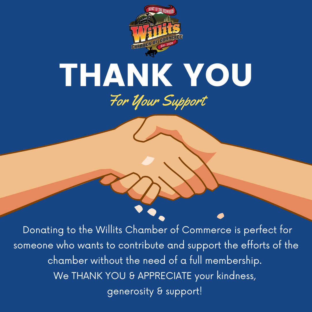 Thank you for supporting the Willits Chamber of Commerce. Your contribution will help us continue to stimulate and strengthen the Willits community. In collaboration we can bring together: